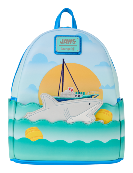 What's beneath the surface to celebrate the 50th anniversary of JAWS?! New Loungefly styles! This mini backpack features a sunset ocean scene with a boat in the distance. An applique of a shark moves up and down amongst the waves! This is a fun piece to gear up for summer and celebrate 50 years of this classic film size:..-• Faux leather (polyurethane)